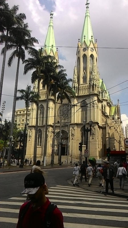 Fachada de la catedral da Sé y parte del patio de la entrada Calle del centro de la ciudad cercana a la Catedral da Sé. Día normal Calle del centro de la ciudad un día normal Patio a la entrada de la catedral da Sé donde se encuentra la estatua de San Pablo y el "punto cero". Patio a la entrada de la catedral da Sé donde se encuentra la estatua de San Pablo y el "punto cero". Panorámica un pocom mas amplia que al foto anterior. Praça da Sé. Primer plano. escultura en bronce de São Paulo. Al fondo las torres de la catedral de Sé.